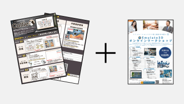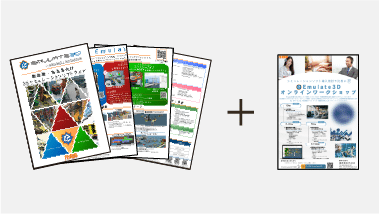倉庫・工場向け3Dシミュレーションソフト「Emulate3D」のパンフレットと、『体験型教育&導入相談プログラム』オンラインワークショップのチラシのセットです。
