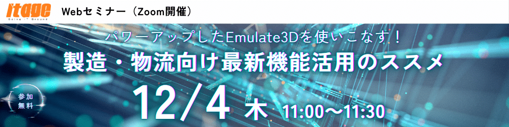 | ウェビナー名 | 「パワーアップしたEmulate3Dを使いこなす!製造・物流向け最新機能活用のススメ」 |